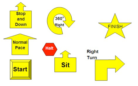 Signs instruct the teams to go fast or slow, to halt (dog must sit at heel), to make turns and circles, to reverse direction, to do a sit-stay-recall or other basic obedience exercises.